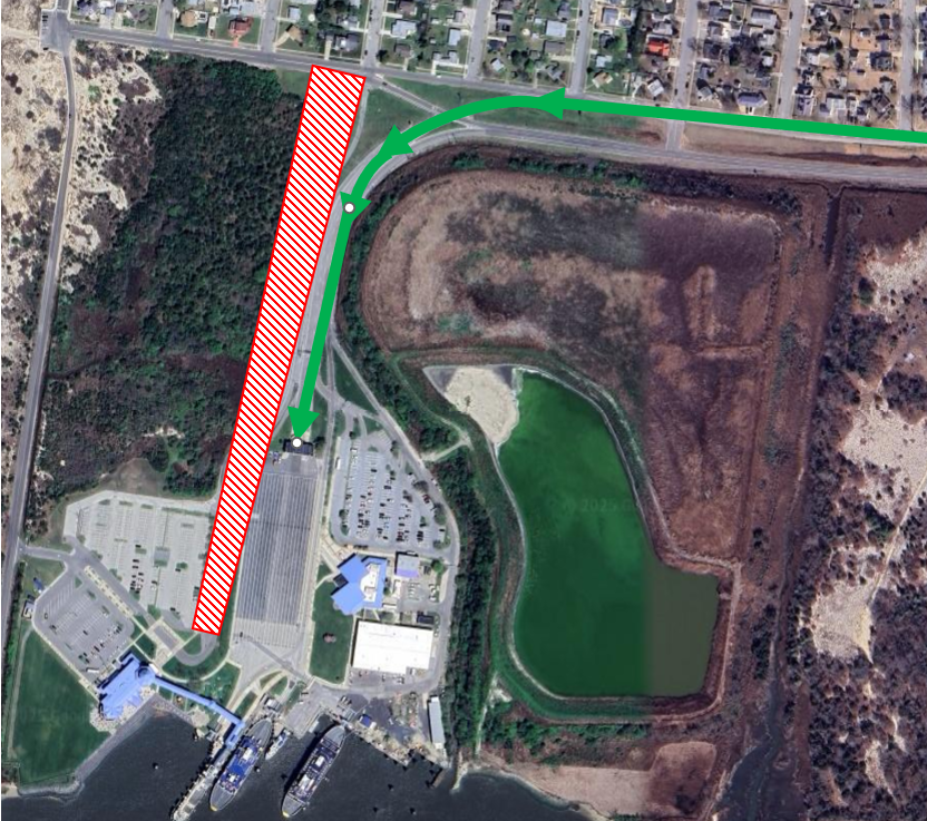 There is no obstruction to access to the tolls or the administration parking lot. Follow the normal curving entrance to the Cape May – Lewes Ferry and check in with tolls, or turn left to visit the administration offices and check in with police.