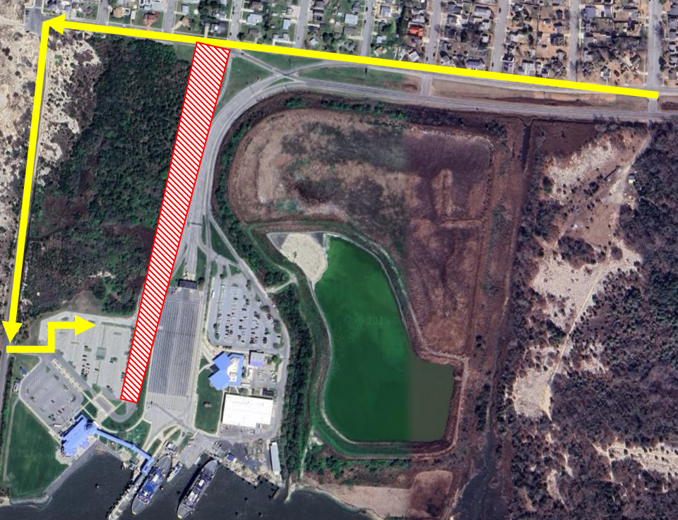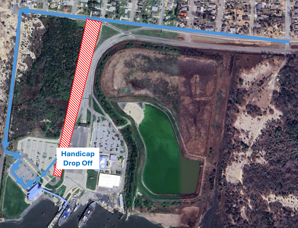 There is no obstruction to access to the tolls or the administration parking lot. Follow the normal curving entrance to the Cape May – Lewes Ferry and check in with tolls, or turn left to visit the administration offices and check in with police.