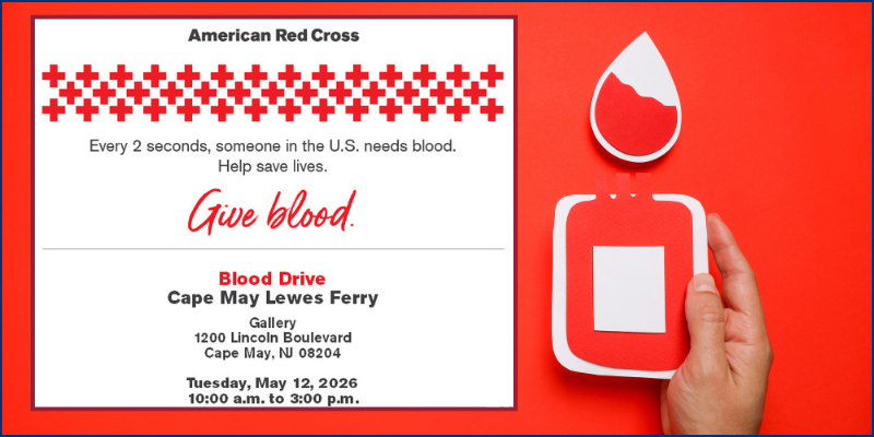 Give the gift of life this spring at the Cape May Ferry Terminal as the American Red Cross returns for a special community blood drive on Tuesday, May 12, from 10:00 a.m. to 3:00 p.m. The drive will take place in the beautiful 2nd Floor Gallery, offering a comfortable and convenient setting for donors to make a meaningful difference close to home. Whether you are a first-time donor or a regular supporter, every donation helps patients in need.